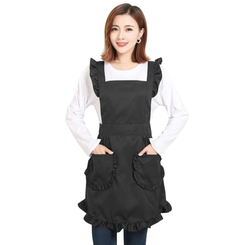 Tablier H à volants pour femmes Kisata, Facile à porter, Costume de soubrette, Tablier simple avec poches, Joli tablier de café, Convient pour un usage domestique, Noir