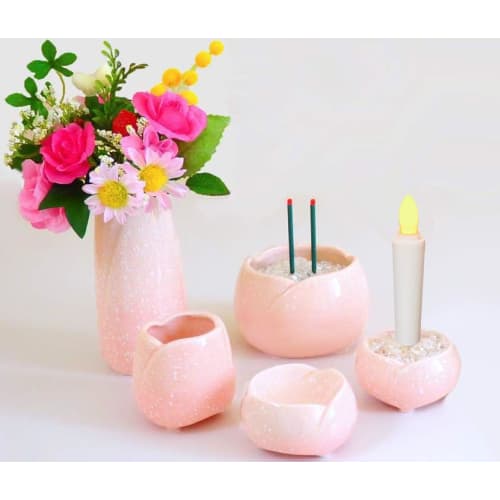 Karen Japanese Ceramic Buddhist Altar Accessories, Yawaragi Sakura, 5-Piece Set with Timer-Operated LEDs, Flickering LED Candles, LED Incense, Buddhis