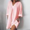 Cette robe élégante à col en V est parfaite pour l'été, offrant un mélange de confort et d'élégance avec ses manches trois-quarts.. Confectionné dans un mélange respirant de coton et de lin, il assure une sensation légère et aérée pour les journées chaudes.. La robe est dotée de poches pratiques, ajoutant une touche pratique à son design chic.. Idéale pour les sorties décontractées ou les promenades tranquilles, cette robe constitue un ajout polyvalent à toute garde-robe.
