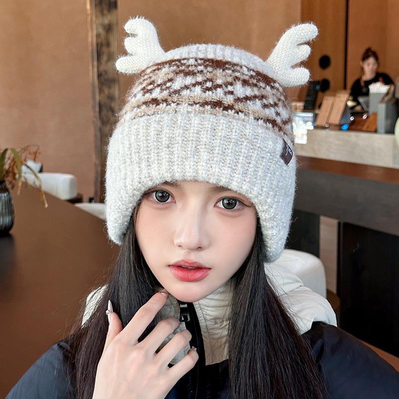 Hat Women's Autumn and Winter Thickened Warm Ear Protection Knitted Hat Showing Face Small Outdoor Cold Proof Deer Antler Pullover Hat