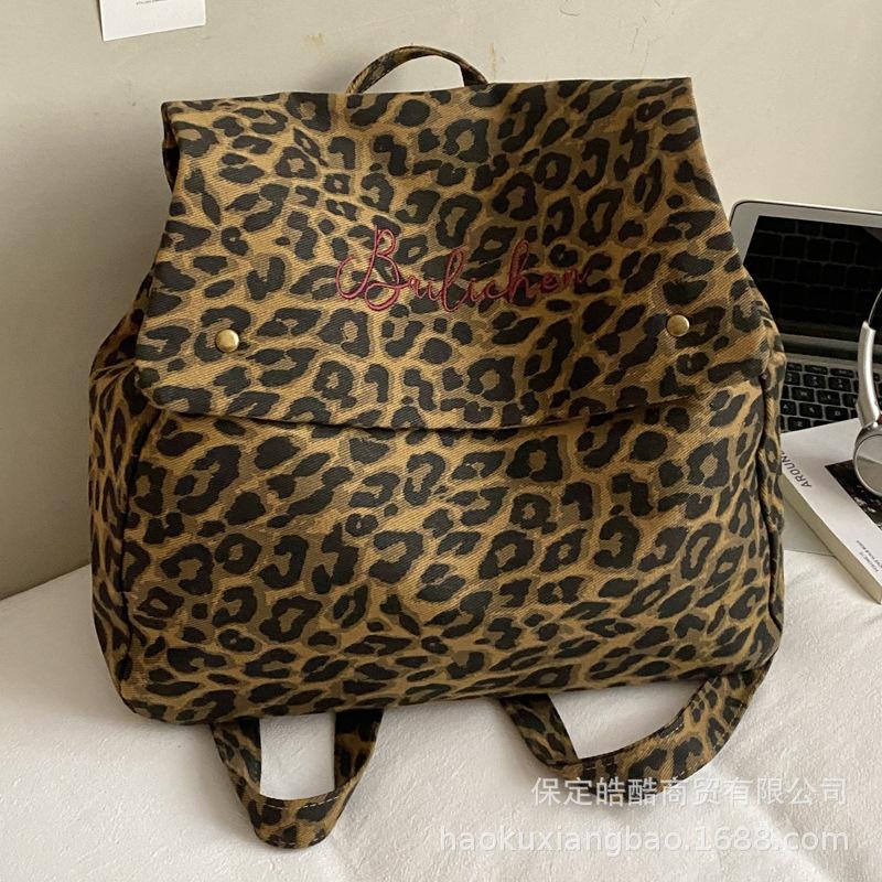 Leopard print backpack women's fashion niche design sense student class bag canvas retro tote bag travel backpack