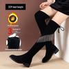 Sortez avec style avec ces bottes exquises au-dessus du genou, conçues pour l'automne 2025. Dotées d'un superbe détail de pompon en strass, ces bottes sont confectionnées avec un matériau extérieur en textile pour un look chic et élégant.. Le design slim fit est complété par un talon épais, ajoutant une touche de sophistication et de hauteur à votre ensemble.. La doublure en peluche artificielle assure chaleur et confort, les rendant idéales pour les temps plus frais.. Avec une semelle en caoutchouc durable, ces bottes offrent une excellente adhérence et un excellent soutien, ce qui les rend parfaites pour les aventures urbaines ou une soirée en ville.. Convient à toutes les personnes à la pointe de la mode recherchant à la fois style et confort.