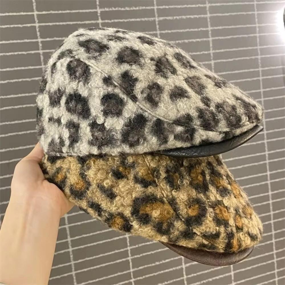 Casquette de baseball à visière en cuir PU Y2K Femme Chapeau Imprimé Léopard Bérets Rétro en Laine d'Agneau