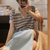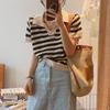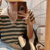 Mode Squelette Rayé Couleur Collision Revers Col V Manches Courtes Chemise Tricotée Courte T-shirt Tops Femme Décontracté Essentiel Coupe Slim Pulls T-shirts