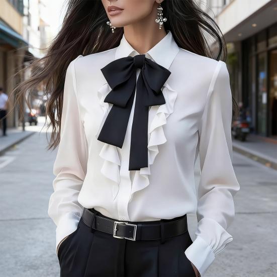 Accents Volants Romantiques: De délicates volants ornent le corps, cascadant depuis l'encolure, la patte de boutonnage ou les poignets.. Ces lignes douces et fluides ajoutent une touche de féminité et de romance à la chemise simple.. À chaque pas, les volants se balancent gracieusement, insufflant un air de superposition tridimensionnelle et d'allure féminine à votre tenue.