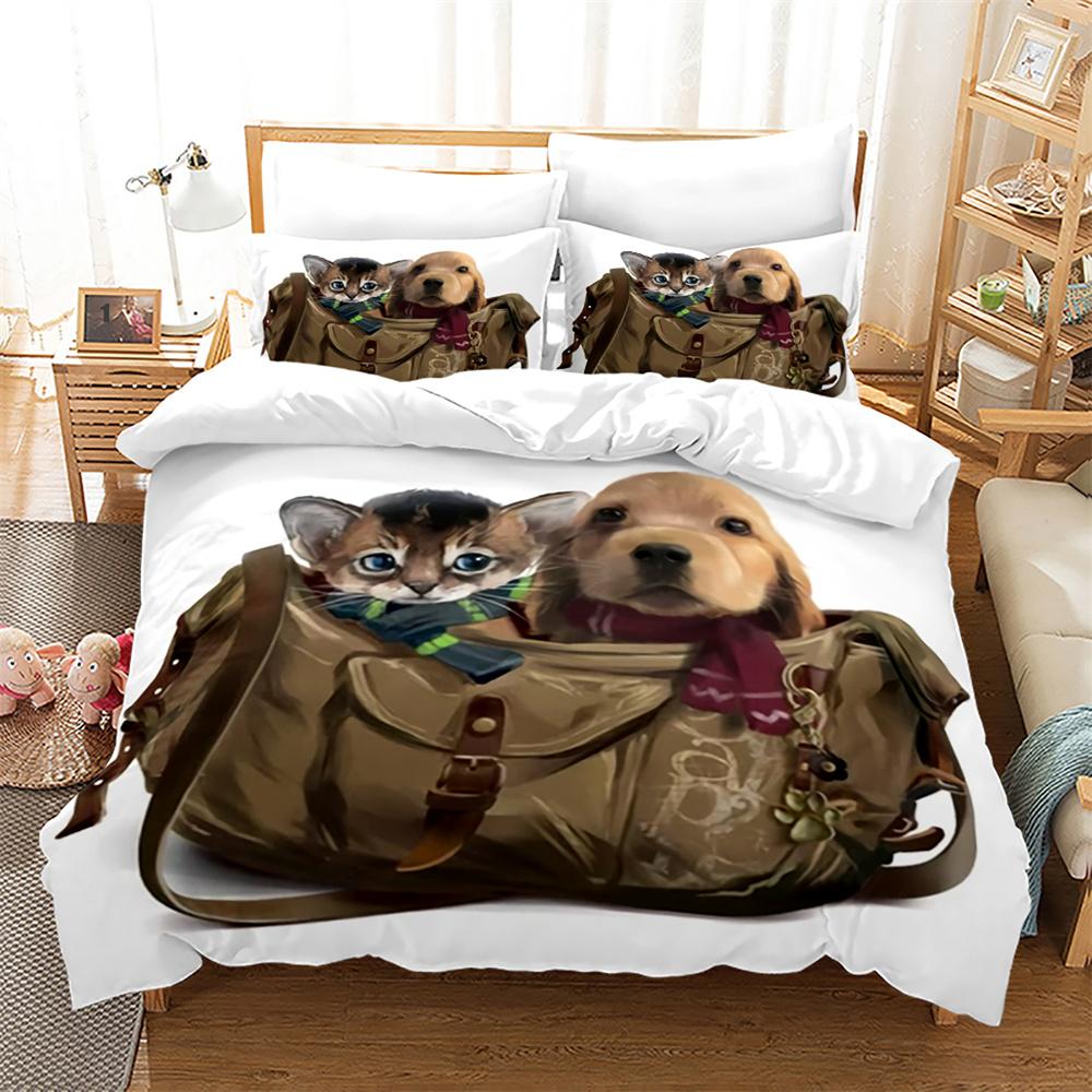 Dog And Cat Duvet Cover Set 3D Print Cute Kawaii Animals King Queen Size Polyester Comforter Cover For Kid Boy Girl Bedding Set