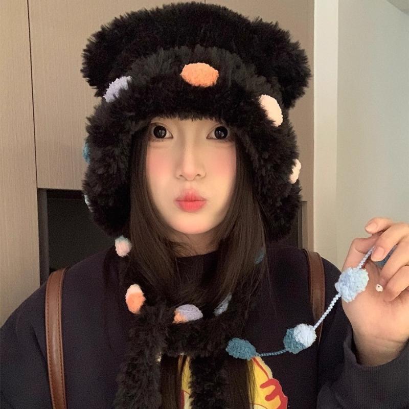 2025 Popular Cute And Fluffy Versatile Little Bear Ear Hat For Women'S Warm Autumn And Winter Colorful Lace-Up Knitted Hat