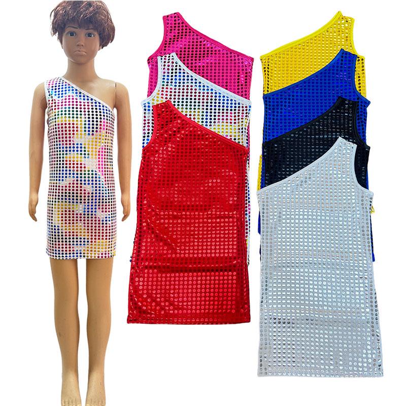 Step onto the dance floor with confidence and style in this exquisite knee-length dance dress, designed to dazzle and delight. Crafted from high-quality acrylic material, this dress features a playful polka dot sequin pattern that catches the light with every move. The elegant round neck design is complemented by a versatile sleeveless and one-shoulder look, adding a touch of contemporary flair. Its asymmetrical cut enhances its dynamic appearance, making it an ideal choice for both baby girls and adults looking to make a statement during performances or special occasions.