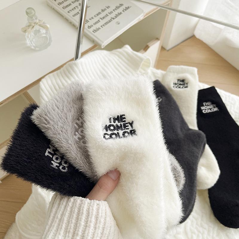 Women's Mid-calf Socks for Autumn and Winter, Thickened Mink Fleece Letter, Fluffy Sleeping Floor Socks, Winter Warm Long Calf Socks