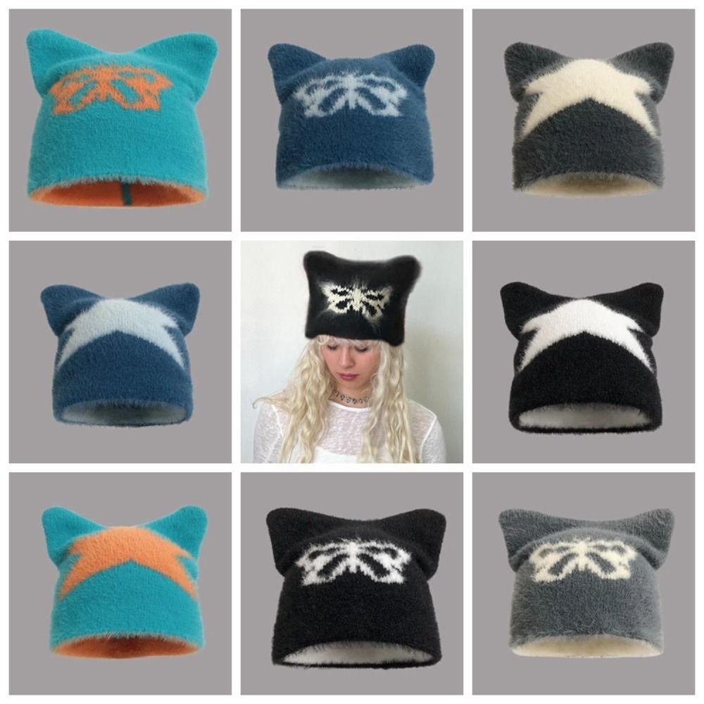 Bonnet Tricoté Style Coréen Étoile Sans Bord Bonnet Mode Oreilles de Chat Laine Chapeau Streetwear