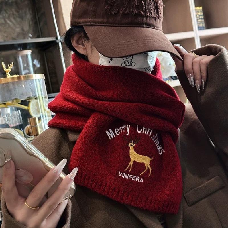 Écharpe Tricotée Mélange Laine Rouge Renne pour Femme - Style Chaleureux de Noël