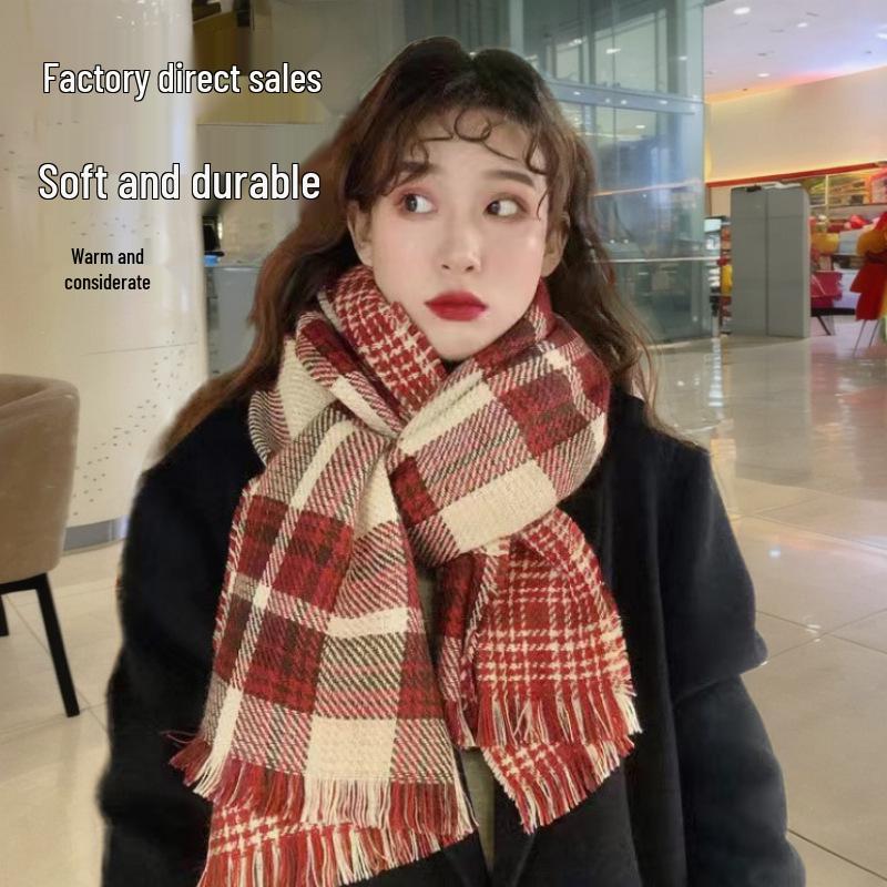 Korean Christmas Style Double-Sided Plaid Imitation Cashmere Scarf - Warm & Retro for Autumn/Winter.