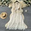 Robe Haut de Gamme pour Femmes en Automne Mode Française Dentelle Manches Longues Patchwork Taille Cintrée Plissée Robe Longue