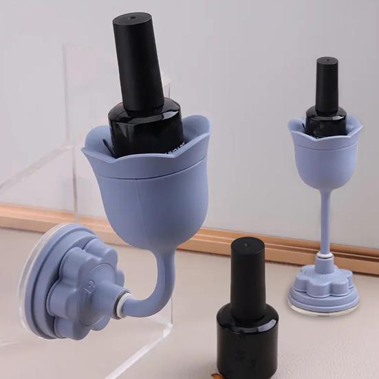 This nail polish holder offers a seamless, easy-to-clean design with smooth surfaces that prevent polish drips, ensuring hassle-free maintenance. Its reliable non-slip base combines a silicone pad and vacuum suction to firmly adhere to glass, tile, and acrylic surfaces, providing excellent stability during quick handling.
