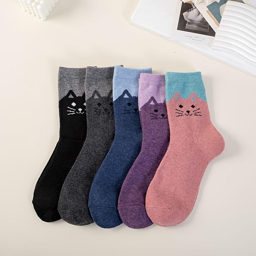 5 pairs of mixed color autumn and winter thick and warm cat head cartoon rabbit blended midsole women's socks