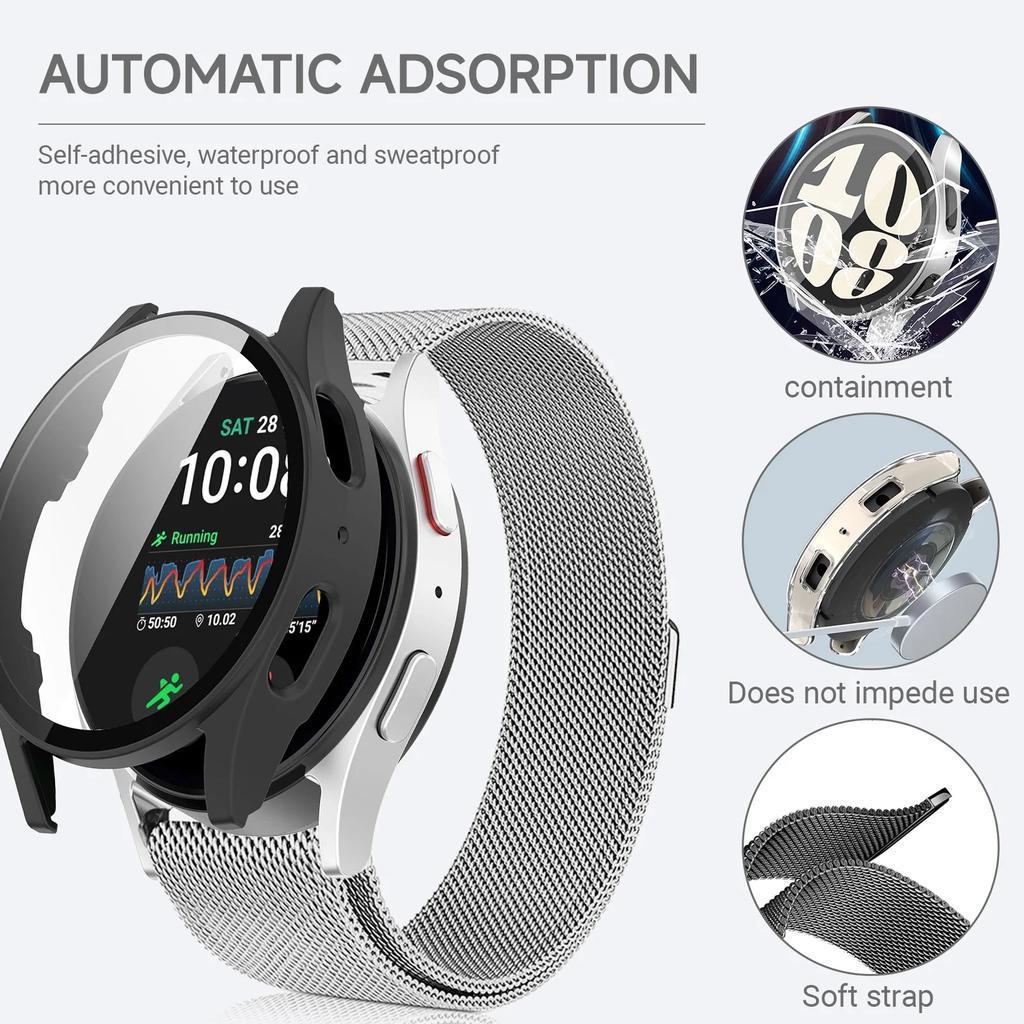 Coque PC + Bracelet Métal pour Samsung Galaxy Watch 7/6/5/4 44mm 40mm Bracelet Milanais Pare-chocs Protecteur en Verre Trempé Accessoires