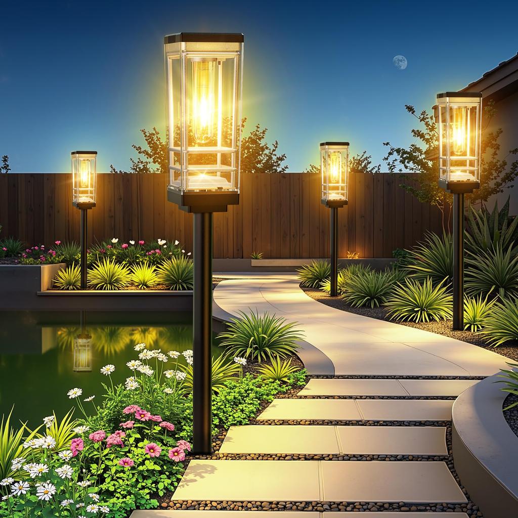 PUAIDA Lampes de Jardin Solaires Extérieures Étanches, IP65 Étanche, Haute Luminosité, Cadre Intérieur Plaqué, LED Blanc Chaud, Allumage/Extinction Automatique, Autonomie de 15 Heures,