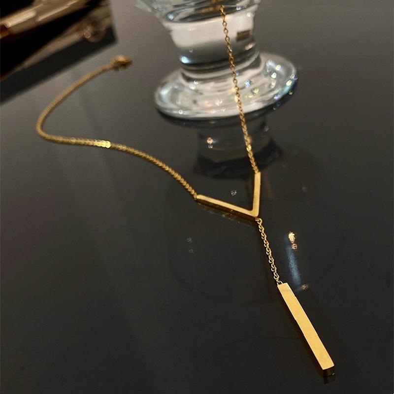 1PC Gold-color Stainless Steel Long Bar Tassel Paragraph V Shaped Collarbone Necklace Female Holiday Party Minimalist Style