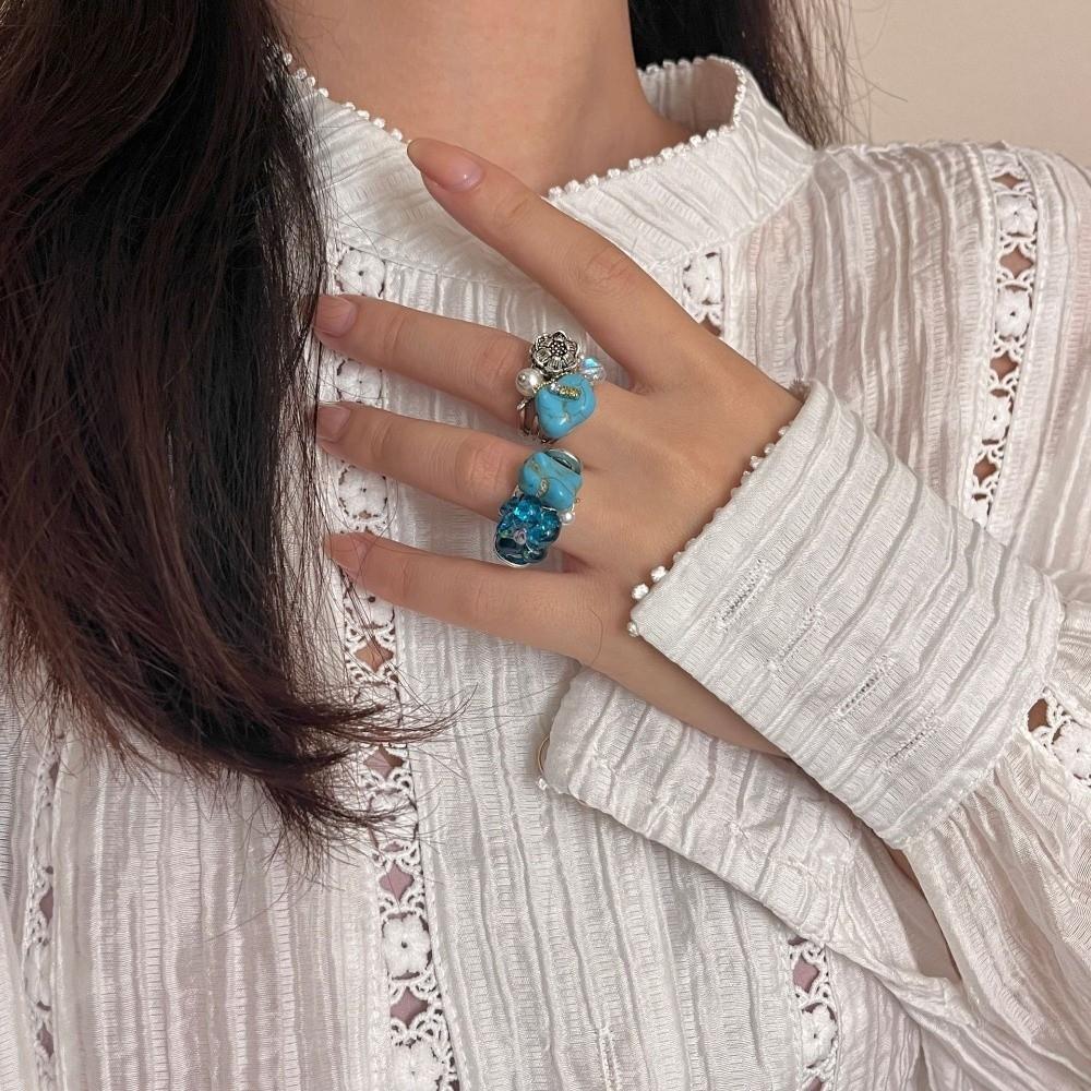 Stackable Glass Flower Ring Rhinestone Western Geometric Ring Fashion Turquoise Rings Jewelry