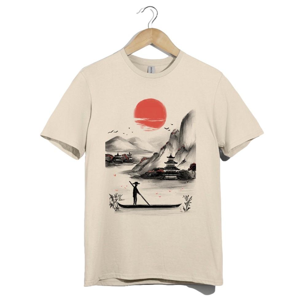 Japanese Mountain Sunset T-Shirt – Minimal Red Sun and Birds Graphic Unisex Tee