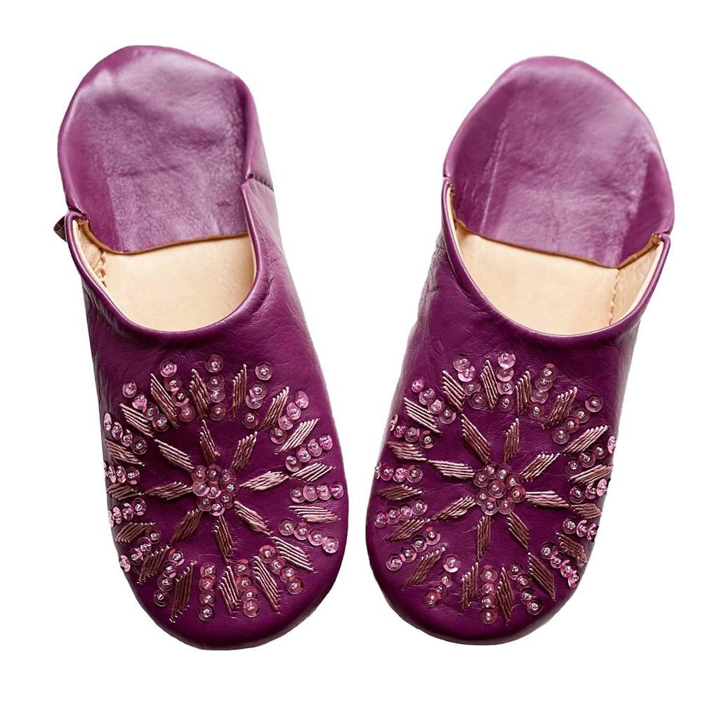« Paillettes » Ces babouches présentent un motif traditionnel d'étoile à huit branches fini avec de magnifiques paillettes.