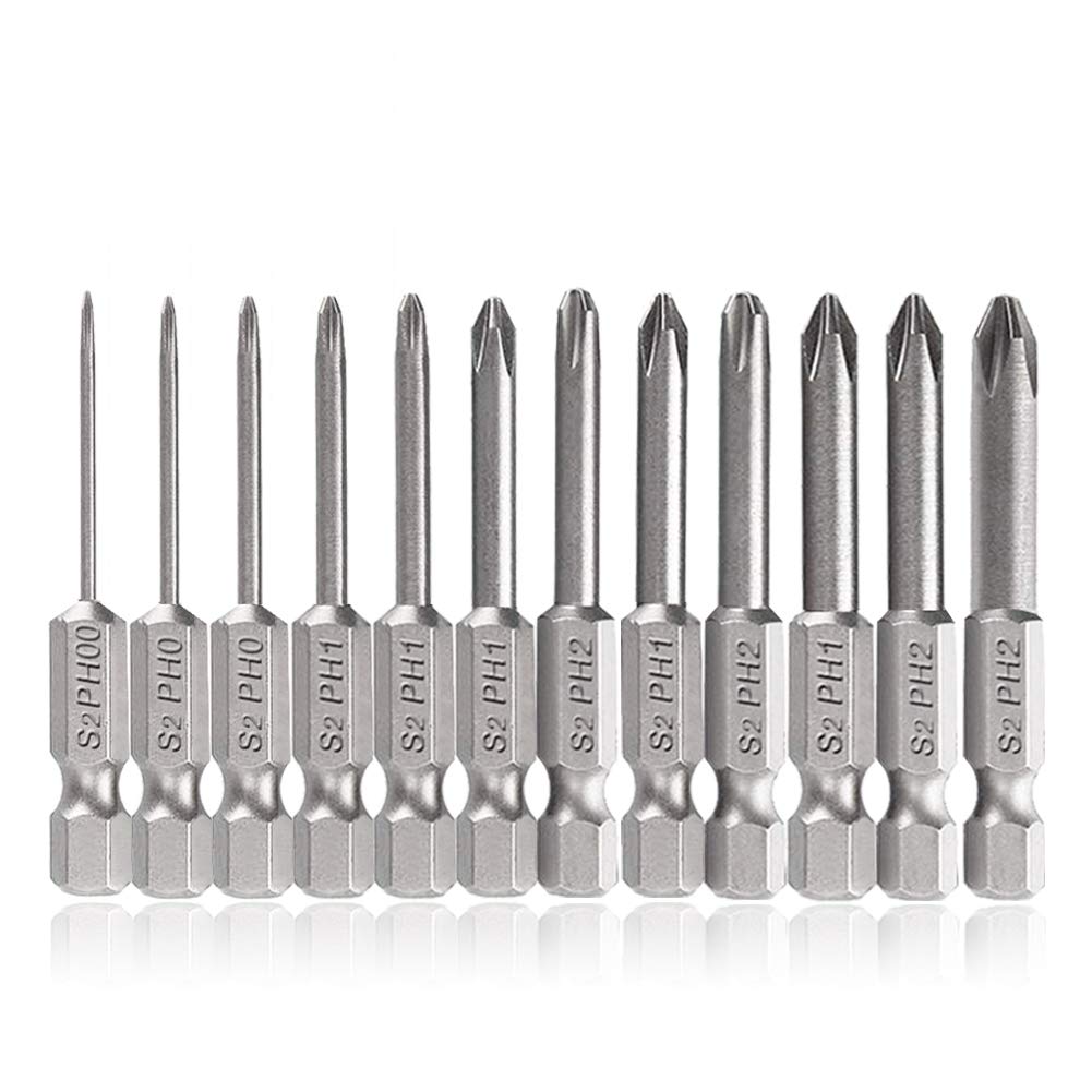 【Specifications】 Material: High quality S2 alloy steel Head type: Cross head Quantity: 12 pcs Length: 50mm Hex shank diameter: 6.35mm (1/4 inch) 【Size】 PH00: Φ1.6mm*50mm PH0: Φ2.0mm*50mm PH0: Φ2.5mm*50mm PH1: Φ3.0mm*50mm PH1: Φ3.5mm*50mm PH1: Φ4.0mm*50mm PH1: Φ4.5mm*50mm PH1: Φ5.0mm*50mm PH2: Φ4.0mm*50mm PH2: Φ4.5mm*50mm PH2: Φ5.0mm*50mm PH2: Φ6.0mm*50mm ★Clearly labeled - Printed specifications make it easy to find what you need. ★Caution: If the size is mismatched, do not turn the screw. This will damage both the screw and the bit. 【Features】 1. Made with high torque, good toughness, and durable material. 2. Made of high-hardness S2 alloy steel. 3. Special heat treatment, super hard wear resistance, and twice the lifespan of a regular screwdriver. 4.