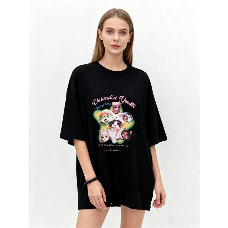 Oversized T-Shirt Black Unlimited Youth Graphic Print With Cute Animals And Text Design For Casual Wear And Street Style