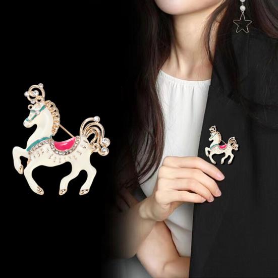 La finition lisse et brillante assure durabilité et éclat des couleurs durable.. Des strass étincelants ornent la selle, la crinière et la queue, ajoutant une touche de glamour et de sophistication.. Équipé d'une épingle de sûreté sécurisée au dos, cet accessoire polyvalent est parfait pour rehausser les manteaux, les écharpes ou les sacs avec style et praticité.