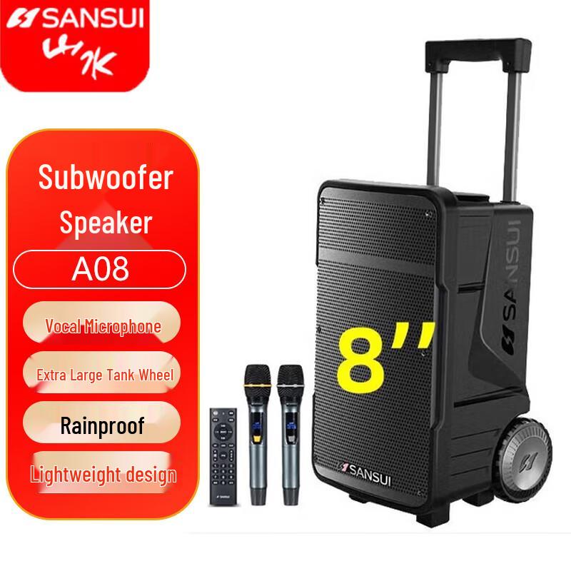Experience powerful, clear sound outdoors with the SANSUI A08 Portable Karaoke Speaker. Designed for square dancing, outdoor performances, and mobile KTV, this Bluetooth 5.0 speaker features heavy bass, a built-in battery for cordless use, and convenient pull rod with wheels for easy transport. Perfect for any outdoor gathering.