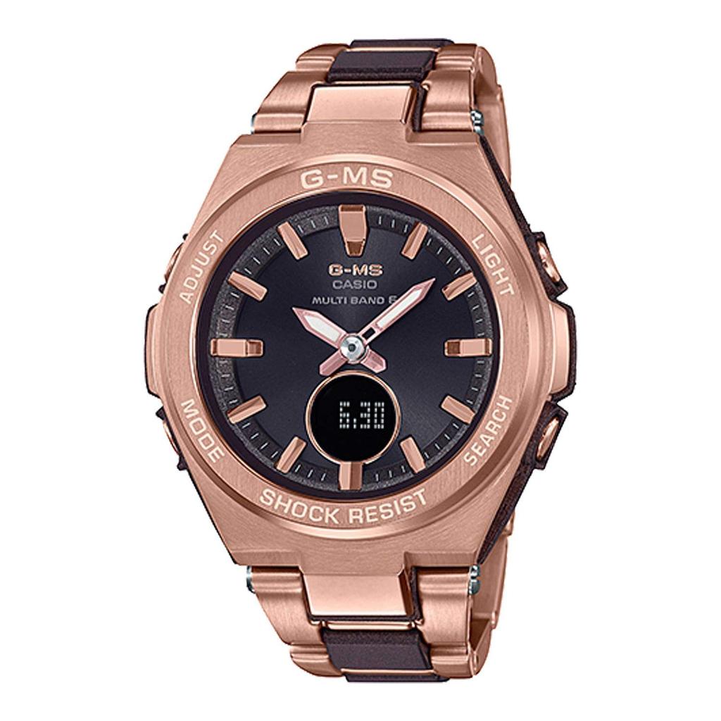 De la BABY-G G-MS (G-Mis) ligne pour femmes actives et sophistiquées, voici un modèle cool avec un design en métal massif. La gamme G-MS comprend un bracelet composite métal et résine et un modèle bracelet entièrement métallique.. La gamme comprend cinq modèles, dont un modèle cool tout en noir et des modèles avec des accents or rose.. Le modèle à bande composite est disponible dans de belles couleurs: tout noir, or rose et blanc cassé, et or rose et marron. La combinaison de différents matériaux crée un look décontracté et sportif.. Ce modèle luxueux rehausse la mode décontractée pour adultes. Le modèle à bracelet en métal est disponible en or rose entièrement et dans une version bicolore argent et or rose pour un look féminin et glamour.. Le dessus du bracelet présente une finition brossée pour un look solide et net.. Le nouveau design permet un boîtier plus petit et plus fin. Sa taille le rend parfait aussi bien pour le travail que pour les loisirs.. Ses fonctions fiables incluent Multiband 6, qui reçoit les signaux radio de six stations à travers le monde et ajuste automatiquement l'heure, l'Heure Mondiale et Tough Solar. Il est également doté d'une lumière LED haute luminosité pour une visibilité optimale dans les endroits sombres.. Ce modèle est doté d'un bracelet composite or rose et marron.
