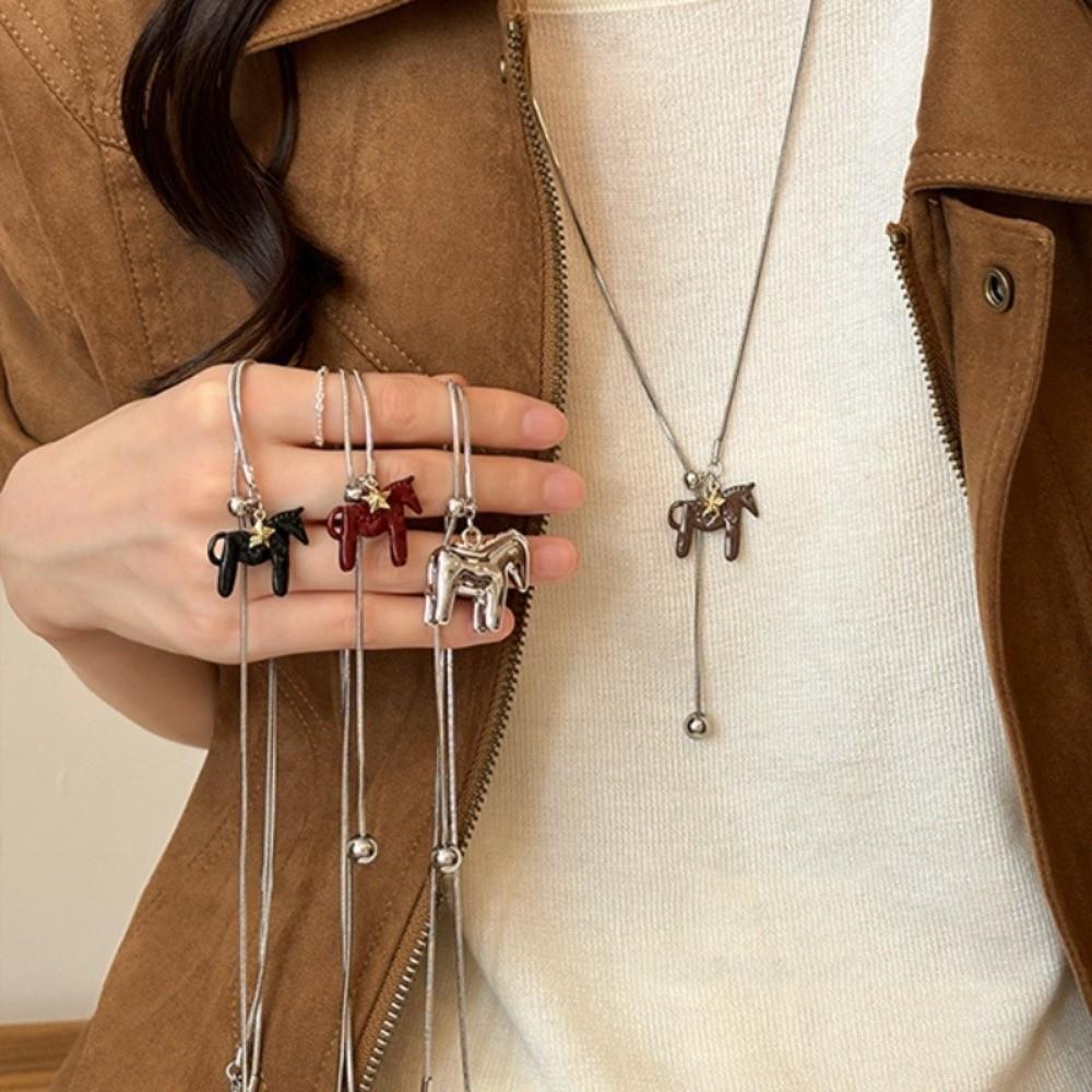 Long Horse Pendant Necklace Silver Plated Y Neck Chain Vintage Enamel Pendant Necklace for Women