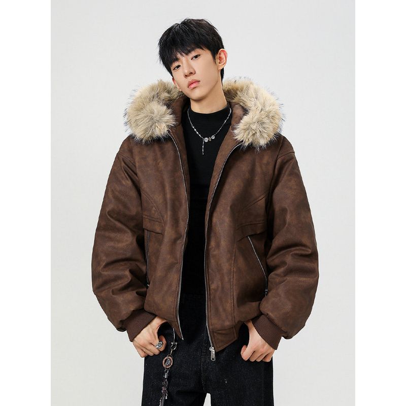 Wassup Large Fur Collar Pu Leather Cotton Jacket for Men and Women, Winter Faux Mink Velvet Thickened Warm Workwear Cotton Coat