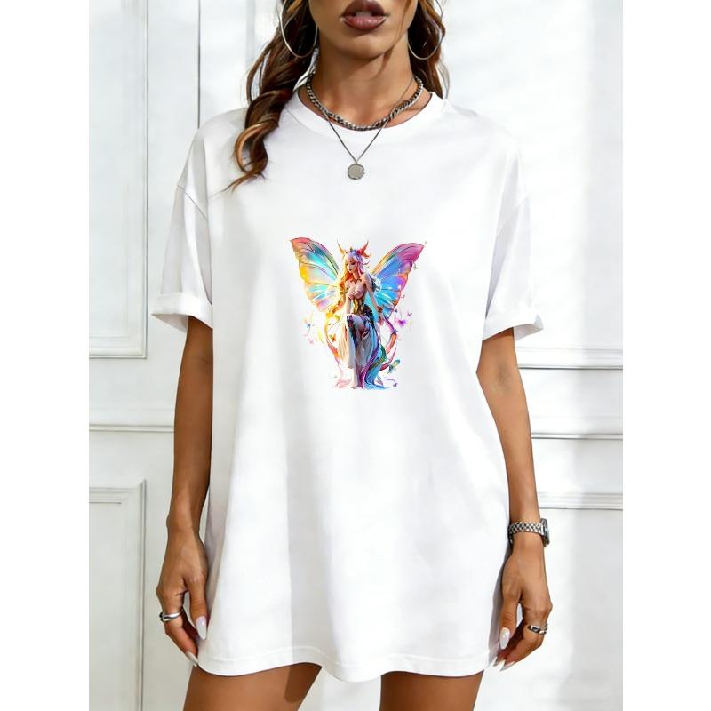T-shirt Oversize Fée Noire Avec Ailes Arc-en-ciel Et Imprimé Fleurs Streetwear Décontracté Pour Femmes