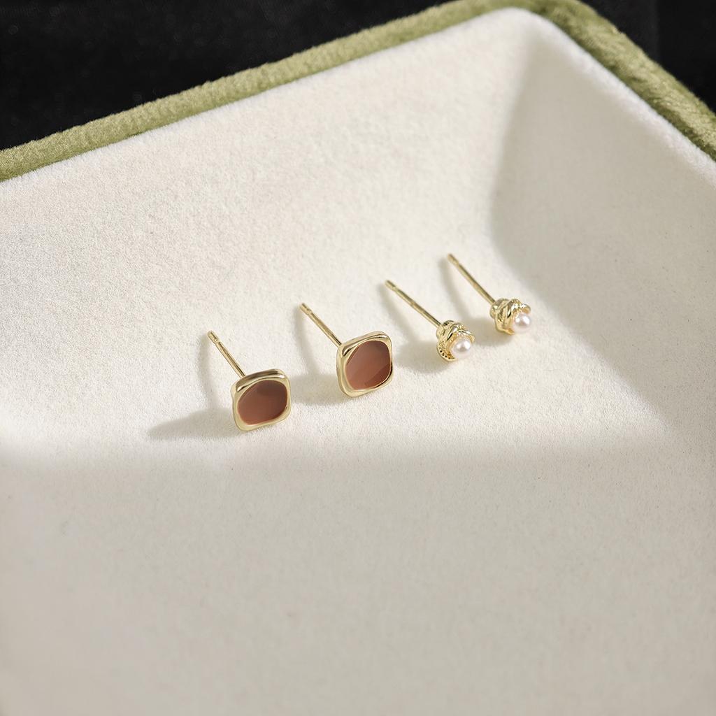 Boucles d'oreilles Puces Géométriques Ambre Œil de Tigre Style Vintage Hong Kong Petites et Délicates Ensemble d'Oreilles Maillard Premium