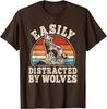 Easily Distracted By Wolves Retro Graphic T-Shirt Vintage Sunset Wolf Howling Print Casual Cotton Tee