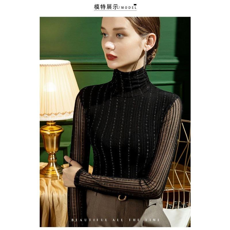 Autumn New High-neck Mesh Bottoming Shirt for Women Plaid Silk Sexy Stacked Collar Lace Top