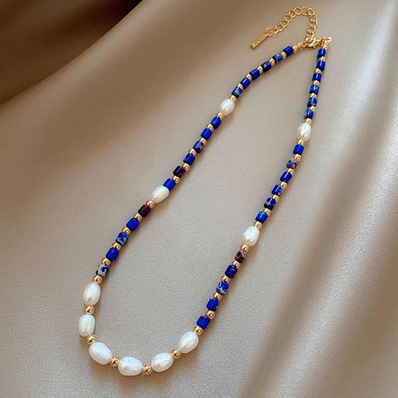 Nouvel Arrivage 100% Naturel Perle d'Eau Douce & Pierre Lapis-Lazuli Plaqué Or 14K Chaîne de Perles Féminine Collier Pour Femmes