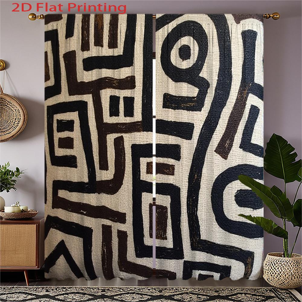 2D Flat 2pcs Black White Abstract Pattern Curtains - Modern Geometric Blackout Curtains with Brown Accent Semi-Translucent Fab