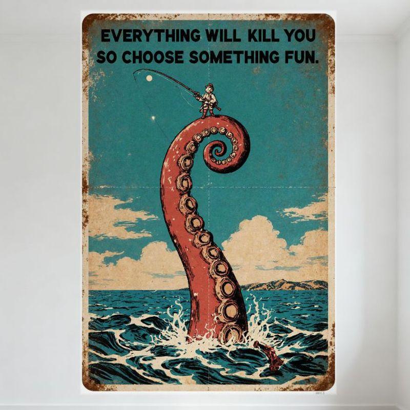 Panneau en étain vintage 'Everything Will Kill You' Poulpe Calmar Tentacule Garçon de l'Océan Pêcheur Affiche Métallique pour Bar Pub Maison Café Décor Mural