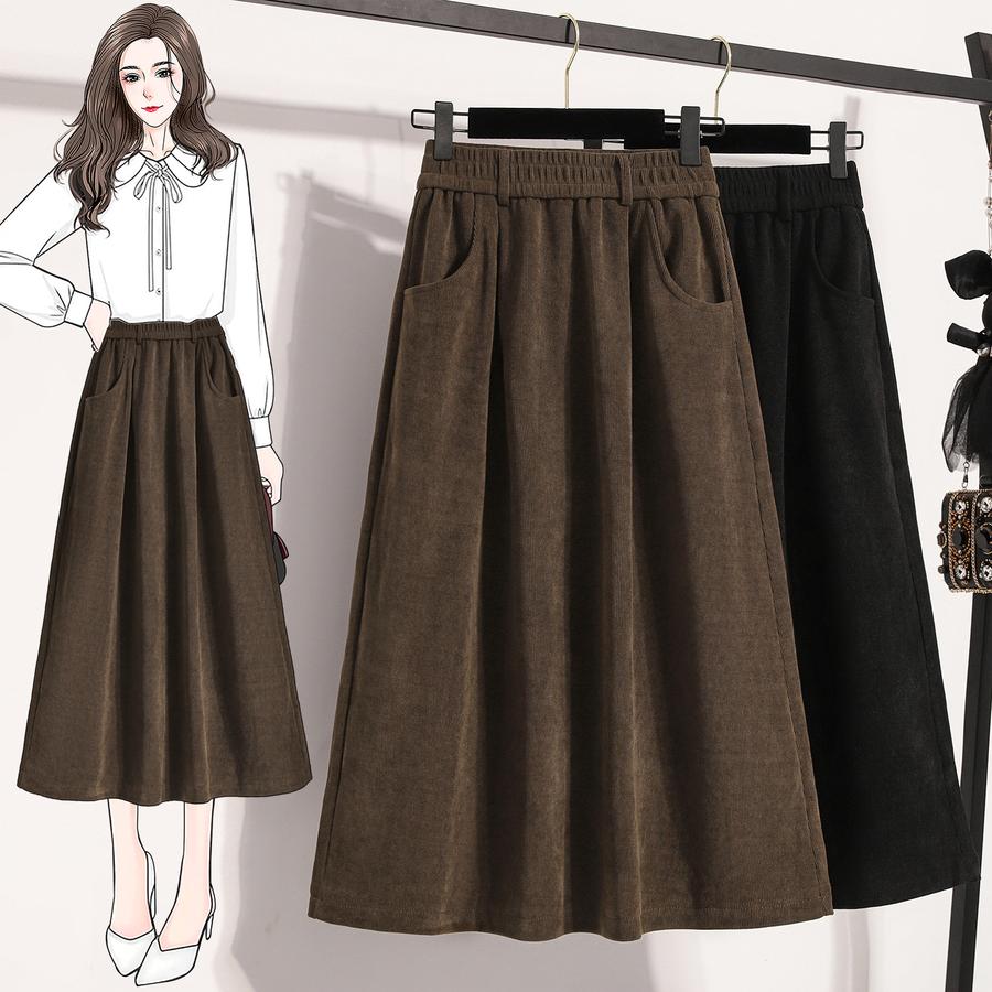 Autumn New Style Corduroy Midi A-Line Skirt for Women, High-Waisted, Slimming, Elastic Waist, Pleated Dress
