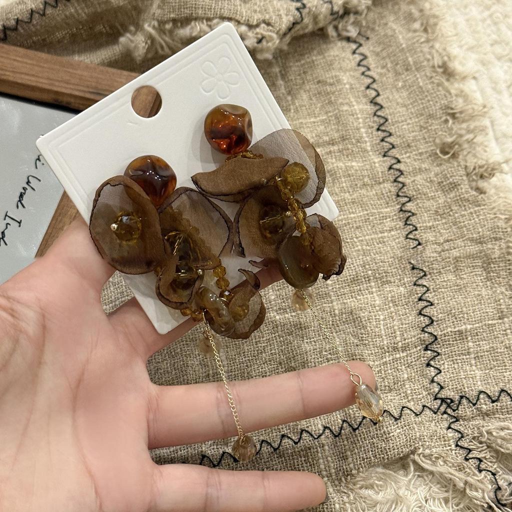 Boucles d'oreilles Puce Fleur en Mousseline Aiguille d'Argent Pompon en Résine Rétro Y2K - Bijoux de Niche Haut de Gamme