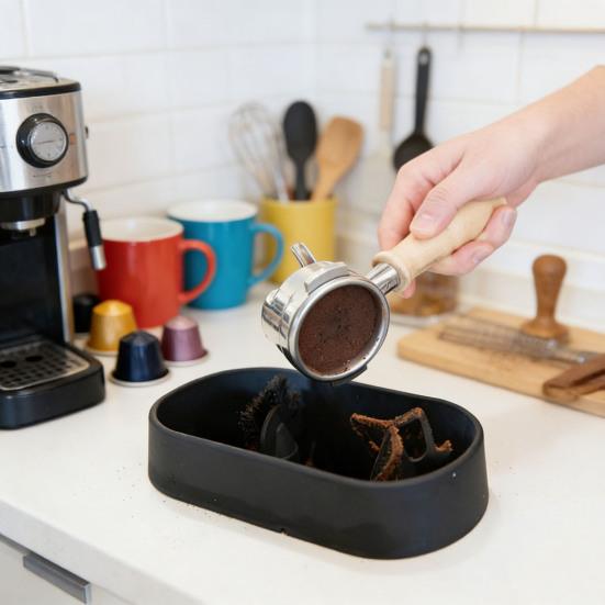 Bac de récupération sécurisé et résistant aux éclaboussures: Doté d'un design noir rainuré antidérapant, le plateau recueille en toute sécurité tous les marc de café pendant le nettoyage.. Il prévient les déversements salissants et garde les comptoirs impeccables.. Ce poste de travail dédié améliore votre routine espresso en organisant l'élimination de la mouture efficacement et hygiéniquement.