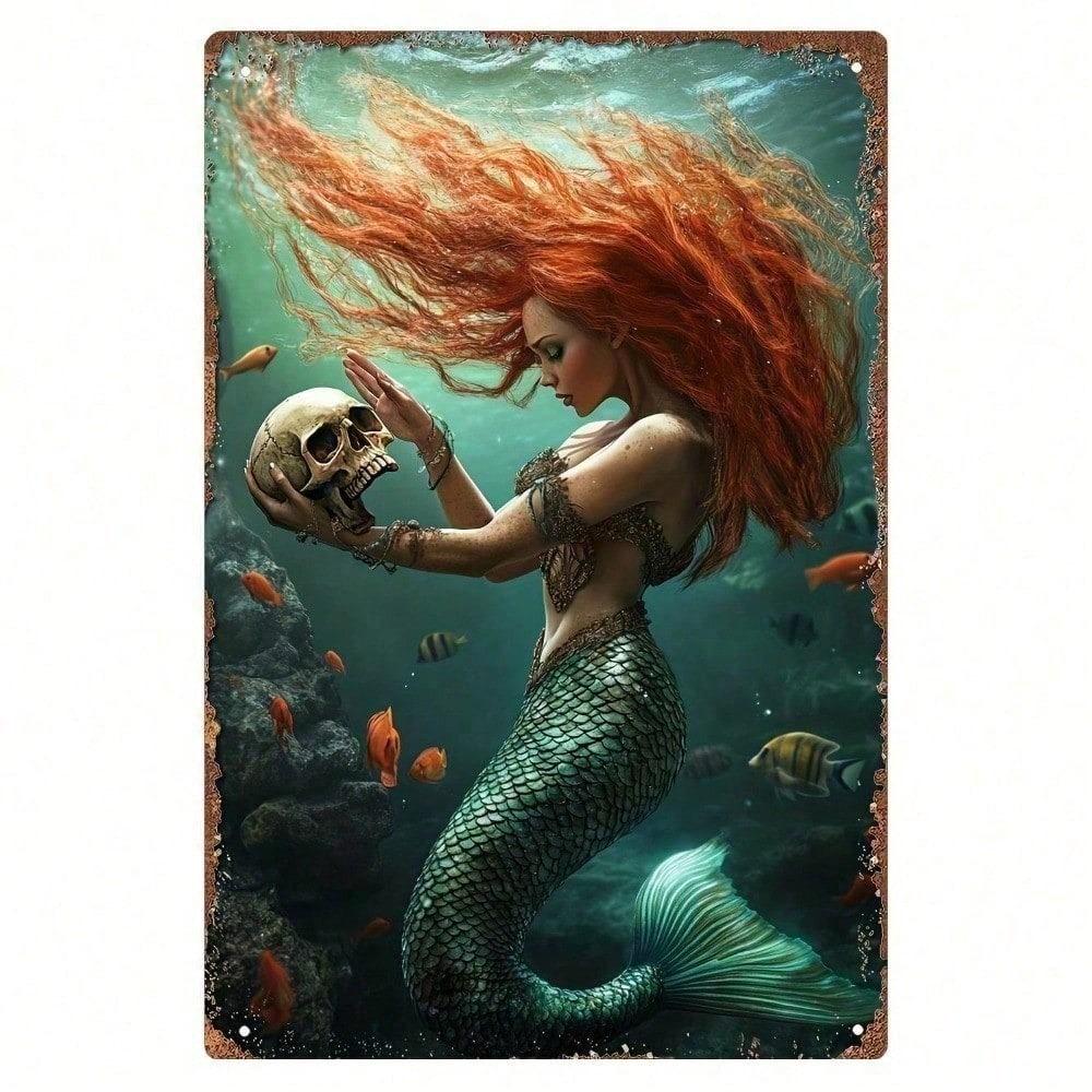 Vintage Mermaid Skull Metal Wall Art Gothic Retro Home Decor Sign for Living Room Bedroom