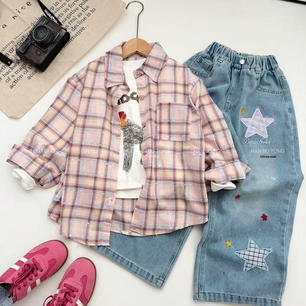 This charming set features a long-sleeve plaid shirt paired with star-embellished jeans, creating a stylish ensemble perfect for Korean-inspired fashion. Made from high-quality cotton, it offers exceptional comfort and durability, making it an ideal choice for the spring and autumn seasons. The playful combination of classic plaid and trendy star patterns ensures your little one will be the epitome of chic and cozy fashion.