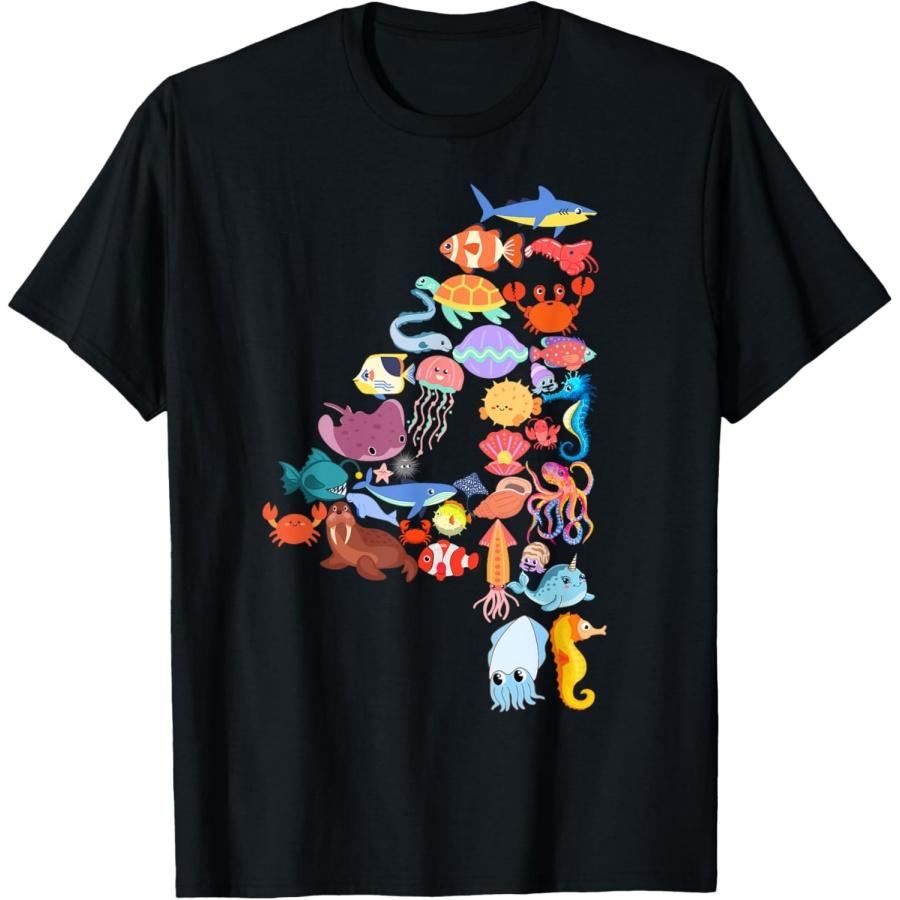 Fun Kids 4th Birthday Ocean Sea Animals Theme 4 Year Old Boy T-Shirt