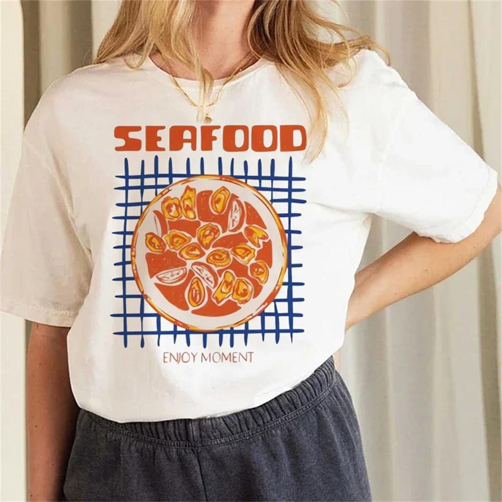 T-shirt Décontracté Style Années 90 pour Femme, Manches Courtes, Imprimé Fruits de Mer Alimentaire Dessin Animé, Très Tendance, Col Rond, Mignon, Modèle 2025