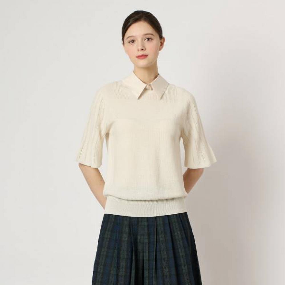 The Detachable Collar Knit Top B4M3K406 features a detachable collar design, allowing for versatile styling. The three-dimensional eyelet knit texture and open collar design create a stylish mood. The regular fit silhouette, with a hand-knitted-like texture, pairs well with anything and is highly versatile as a standalone piece. Color options include Navy and Cream.