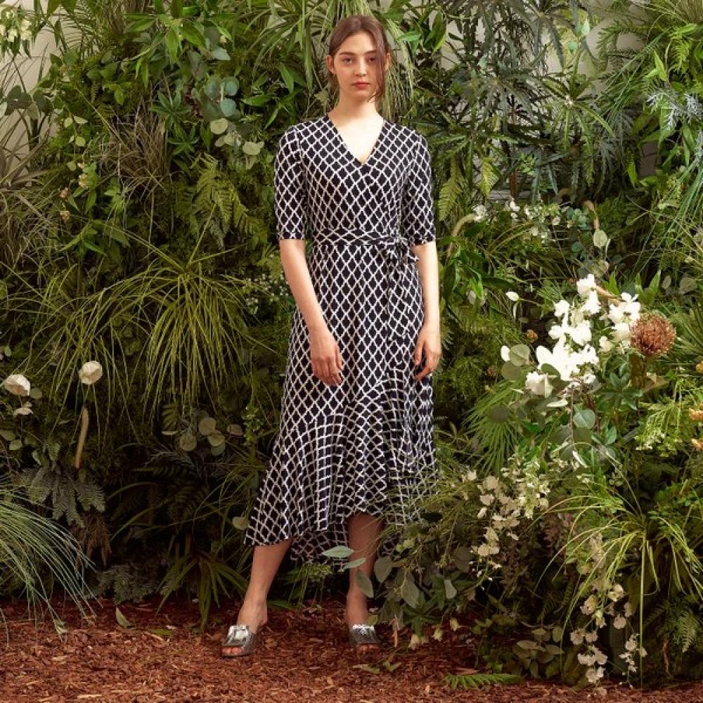 Cette robe portefeuille présente un design à manches 3/4 orné de volants, soulignant une silhouette élégante.