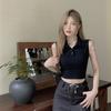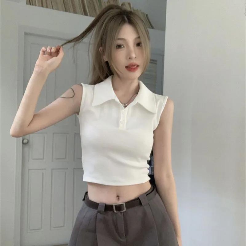 Haut Court Débardeur Col Polo Côtes Coupe Ajustée Uni Couleur Été pour Femme