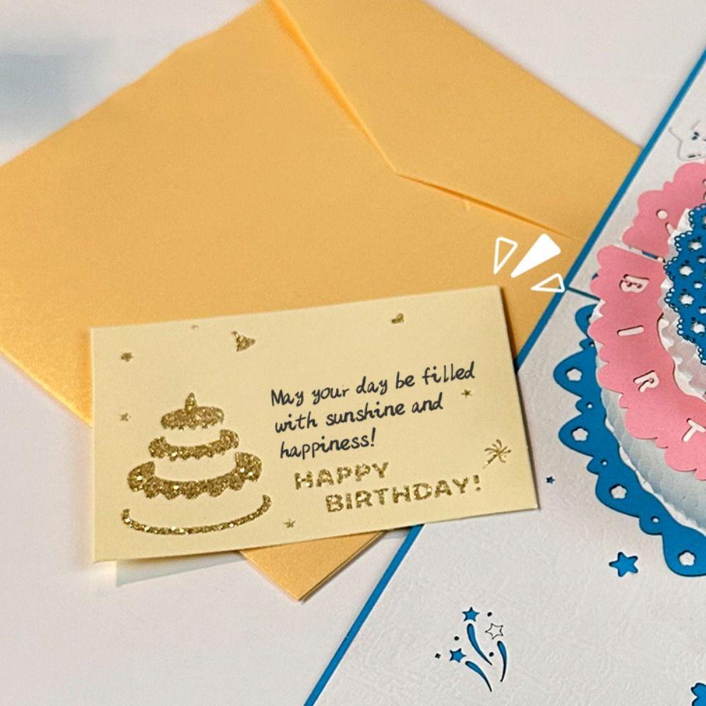 New 3D Pop-Up Happy Birthday Card 2-Layer Birthday Cake with Envelope Greeting Card Hollowed Out Flowers Foldable Gift Card